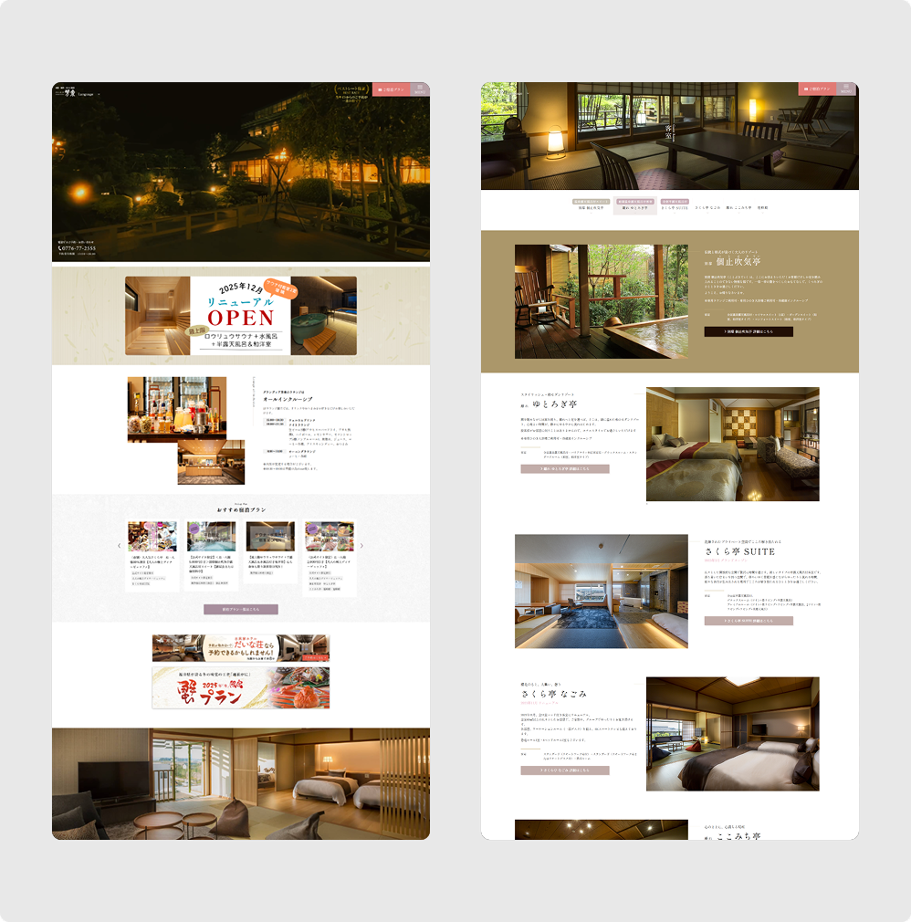 グランディア芳泉様のWebサイトは、あわら温泉の旅館としての上質感に加え、多彩な客室タイプや館内での過ごし方まで丁寧に伝えています。